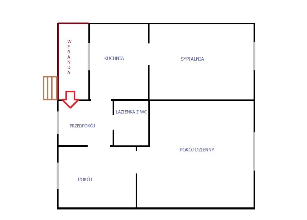 * PARTER:układ pomieszczeń przechodni: 3 pokoje, kuchnia, łazienka z WC i przedpokój