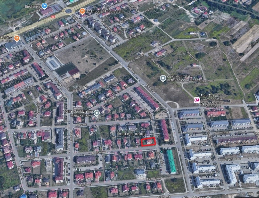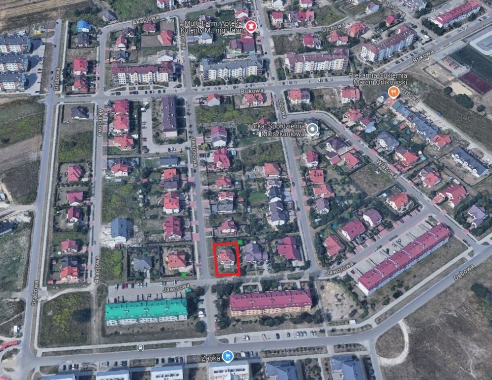Nieruchomość jest położona w samym środku osiedla, u zbiegu dwóch ulic, wśród zabudowy jednorodzinnej i wielorodzinnej.