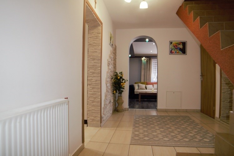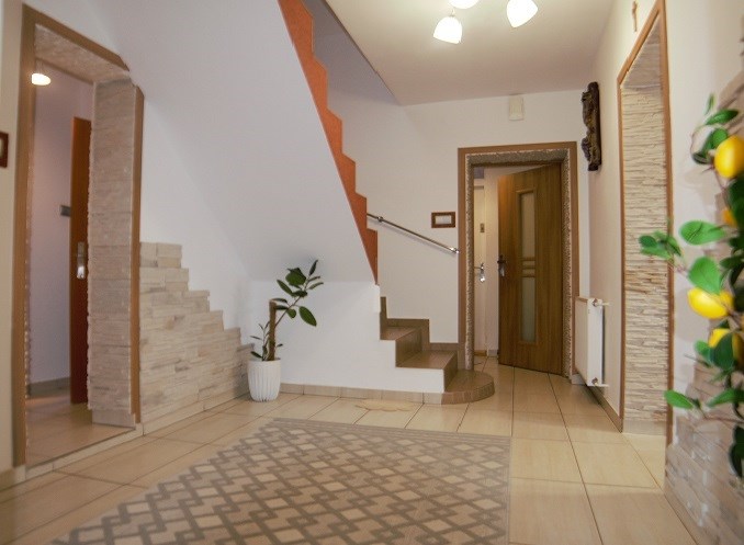 5. OPIS WYKOŃCZENIA:na podłogach w kuchni, przedpokojach, łazienkach, hallu terakota, w pokojach panele oraz w jednym deski
