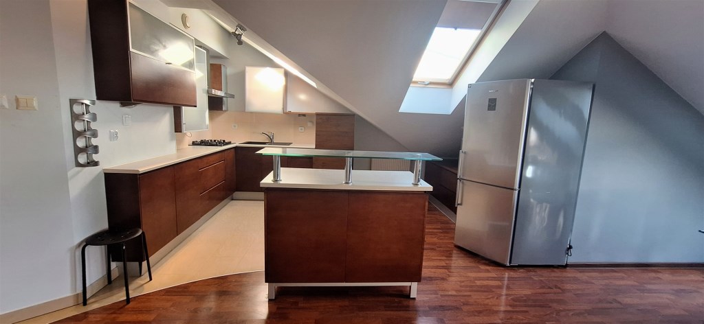 Mieszkanie bardzo widne – 11 okien, w tym 7 dachowych. Ogrzewanie i ciepła woda z pieca dwu-funkcyjnego.