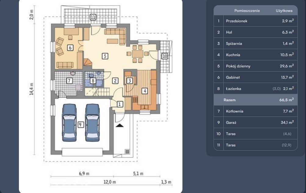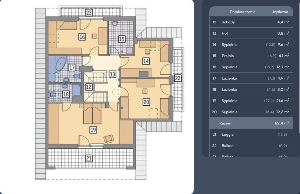 Powierzchnia pokoi: 29,6; 13,7; 13,7; 9,6; 21,6; 12,3