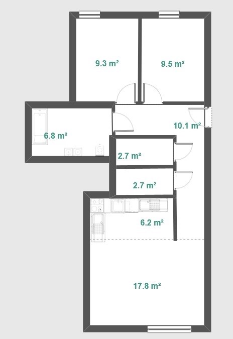 Powierzchnia pokoi: 17,8; 9,5; 9,3;